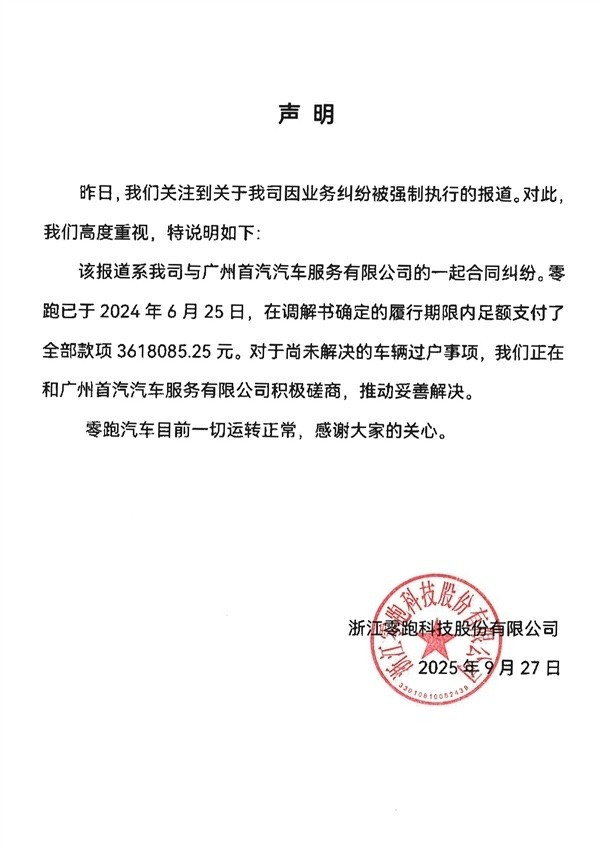 昨日,零跑汽车回应称,款项已于2024年6月25日足额支付,对于尚未解决的车辆过户事项,正在和广州首汽汽车服务有限公司积极磋商,推动妥善解决,零跑汽车强调目前一切运转正常。(萧健)